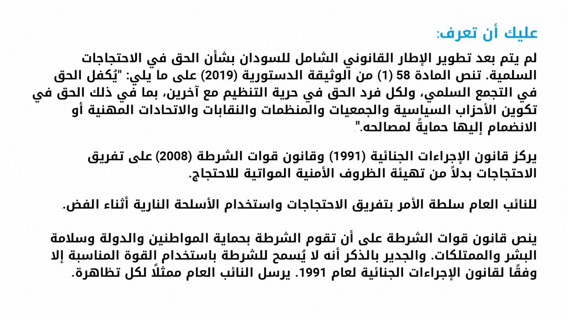 تنص المادة 21 من العهد الدولي الخاص بالحقوق المدنية والسياسية، والذي انضم إليه السودان كطرف منذ 18 مارس 1986، على ما يلي: "يكون الحق في التجمع السلمي معترفًا به. ولا يجوز أن يوضع من القيود على ممارسة هذا الحق إلا تلك التي تفرض طبقًا للقانون وتشكل تدابير ضرورية، في مجتمع ديمقراطي، لصيانة الأمن القومي أو السلامة العامة أو النظام العام أو حماية الصحة العامة أو الآداب العامة أو حماية حقوق الآخرين وحرياتهم."