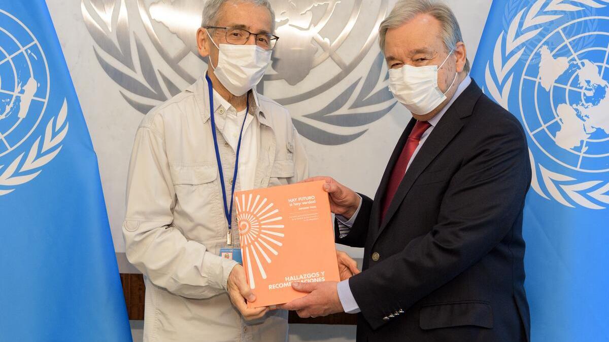 New York, 14 July 2022. The Secretary-General met yesterday, at UN headquarters, with Father Francisco de Roux, the President of Colombia’s Truth Commission, along with fellow commissioners, to receive a copy of the recently issued Final Report of the Commission, a major milestone and achievement of the peace process.
