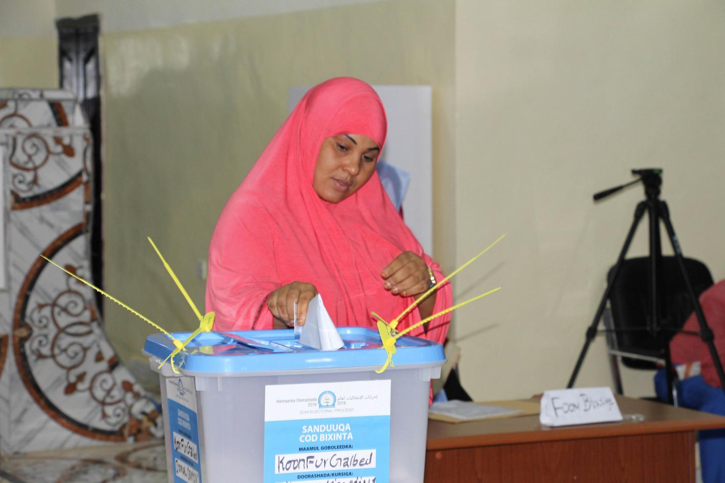 A delegate casts her vote during the electoral process to choose members of the Lower House of the Somali Federal Parliament in Baidoa, Somalia on November 25, 2016.