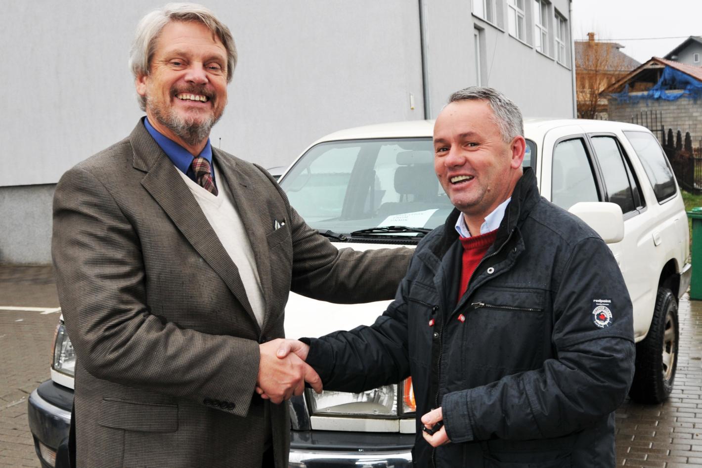 UNMIK donates vehicles to the people of Kosovo DSRSG Robert Sorenson (right) meets Burim Berisha, Mayor of Fushë Kosovë/Kosovo Polje Fitim Selimi, Deputy Mayor of Lipjan/Lipljane, signs handover documents to accept UNMIK's…