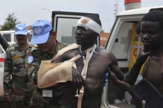 A wounded civilian arriving in Juba after an ambush on an UNMISS convoy by unidentified assailants near Gumuruk in Jonglei State on 9 April. Five peacekeepers and two civilians working with the mission were killed in the…
