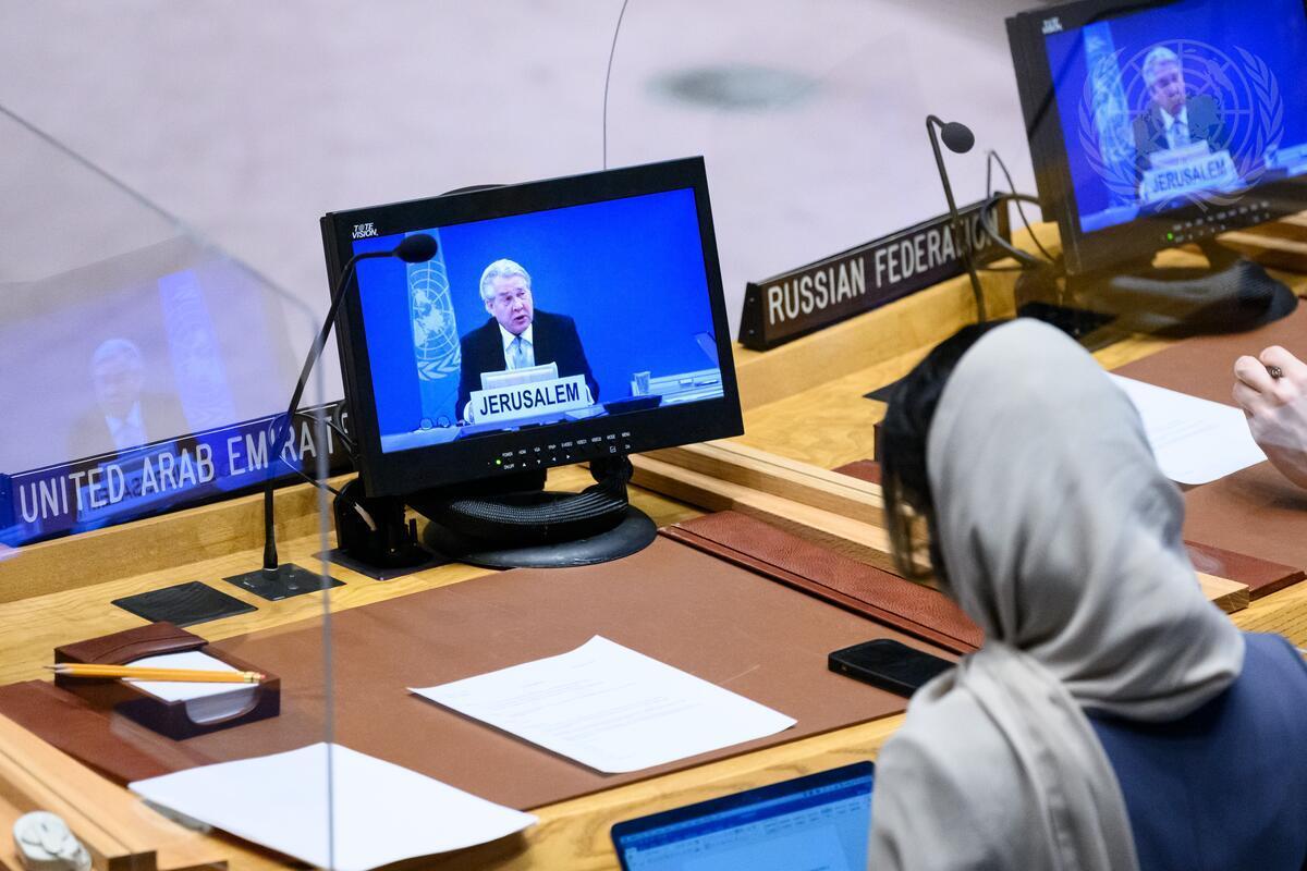 Tor Wennesland (on screen), Special Coordinator for the Middle East Peace Process, briefs the Security Council meeting on the situation in the Middle East, including the Palestinian question.(UN Photo/Loey Felipe - 19/01/2022)